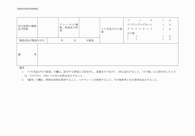 6 落成検査を受けようとする者は、クレーン落成検査申請書(様式第四号)を所轄労働基準監督署長に提出しなければならない。この場合において、法第八十八条第一項ただし書の規定による認定(以下「認定」という。)を受けたことにより前条の届出をしていないときは、同条の明細書、組立図、強度計算書及び書面その他落成検査に必要な書面を添付するものとする。
