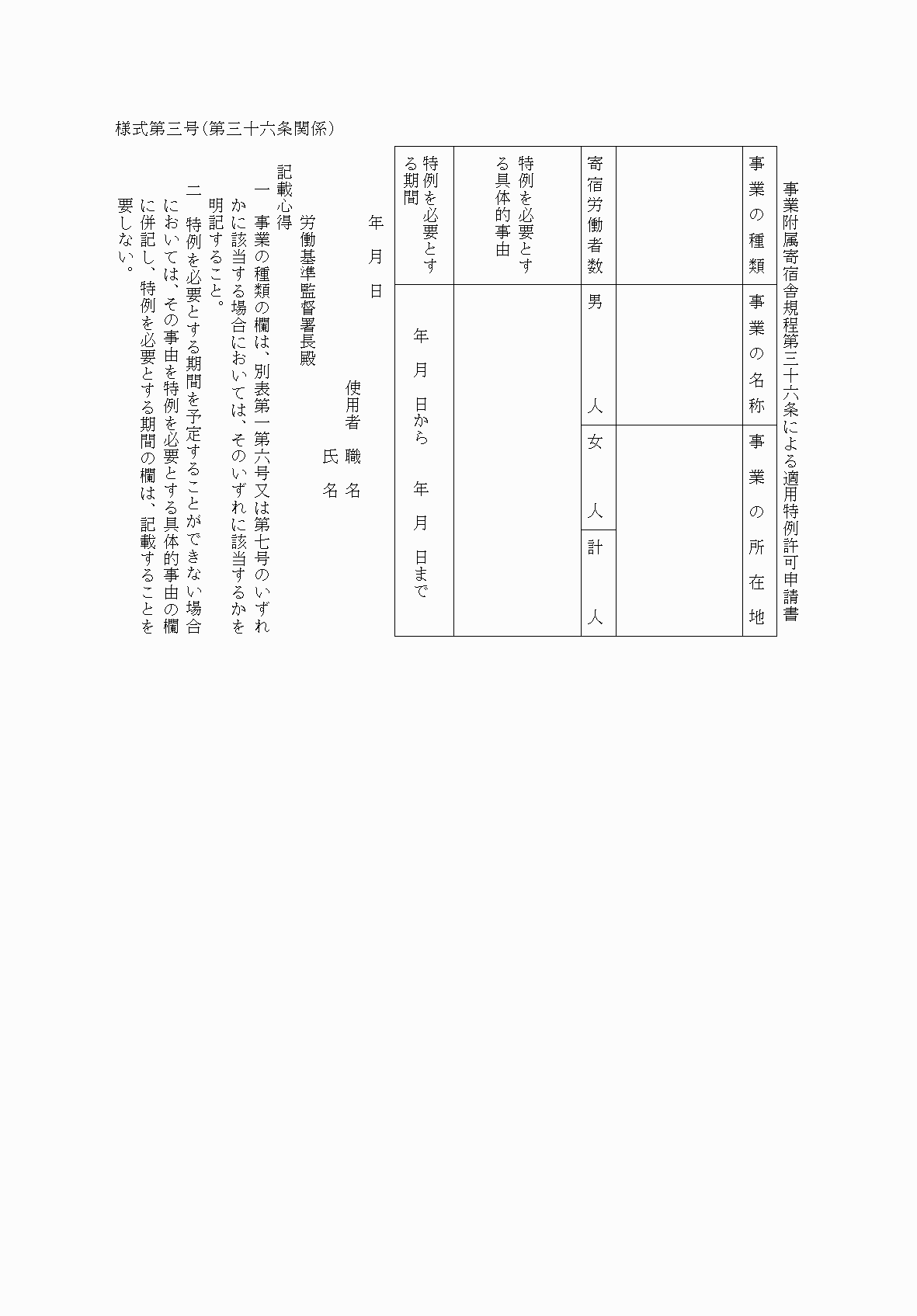 第三十六条 法別表第一第六号及び第七号に掲げる事業の寄宿舎又は常時十人に満たない労働者を六箇月を超える期間寄宿させる寄宿舎について様式第三号により所轄労働基準監督署長の許可を受けた場合には、第八条、第十七条、第十八条、第十九条、第二十一条、第二十五条、第二十六条、第二十七条又は第二十八条の規定はこれを修正して適用する。