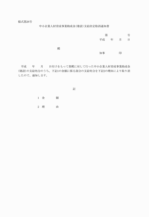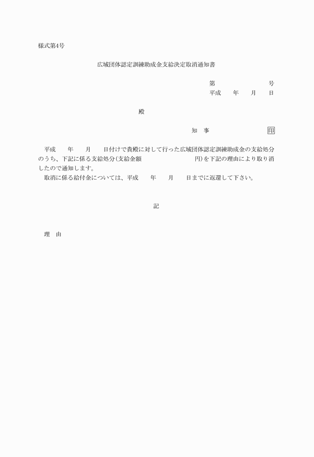 管轄都道府県知事は、助成金の支給を受けた広域団体が、偽りその他不正の行為によって助成金の支給を受けたことが明らかになった場合には、広域団体認定訓練助成金支給決定取消通知書(様式第4号)により、当該広域団体に対して支給した助成金の全部又は一部の支給決定を取り消す旨の通知を行うとともに、既に支給した助成金の全部又は一部を返還させるものとする。