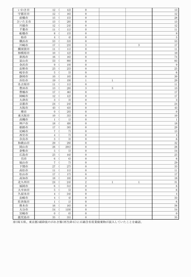 これに伴い、石綿含有建材の分別解体等に重点を置いた内容として実施を依頼した「建設リサイクル法に関する全国一斉パトロール」及び破砕施設への立入検査の結果、一部の自治体において、分別解体等の不十分な箇所やコンクリート塊等の特定建設資材廃棄物への石綿含有産業廃棄物の混入事例が確認されました。