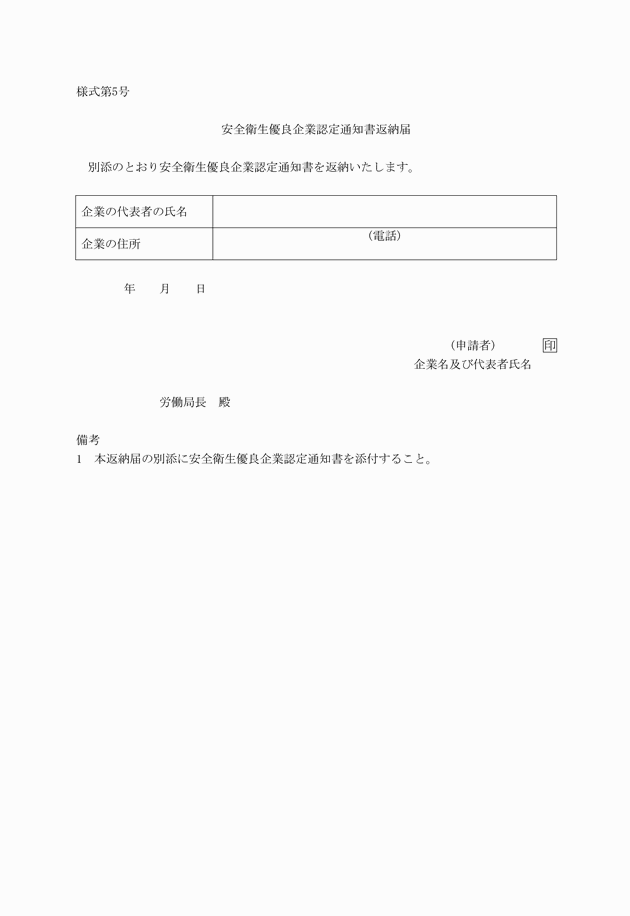 誓約書の記の2又は3に基づき、「安全衛生優良企業認定通知書返納届」(様式第5号)により認定企業から認定通知書が自主的に返納された場合には、その旨を本省安全衛生部計画課計画班に報告すること。なお、後記5による認定の取消を受けた場合には、前記3の(2)のウのとおり、再度、認定申請をすることについて一定の制約が生じるが、ここでの自主的な返納の場合には、このような制約はないので、認定基準を満たしていることが確認できた場合には、再度、認定申請を行うことができることに留意すること。
