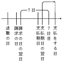 ロ 当該請求があつた日から七日以内の特定の日に当該賃金を支払う旨の約束を事業主がしたときには、当該特定の日が所定の支払期日前の日であつても、事業主は、当該特定の日の翌日から支払をする日までの間について法第六条の遅延利息を支払わなければならないこと。(以上次図参照)